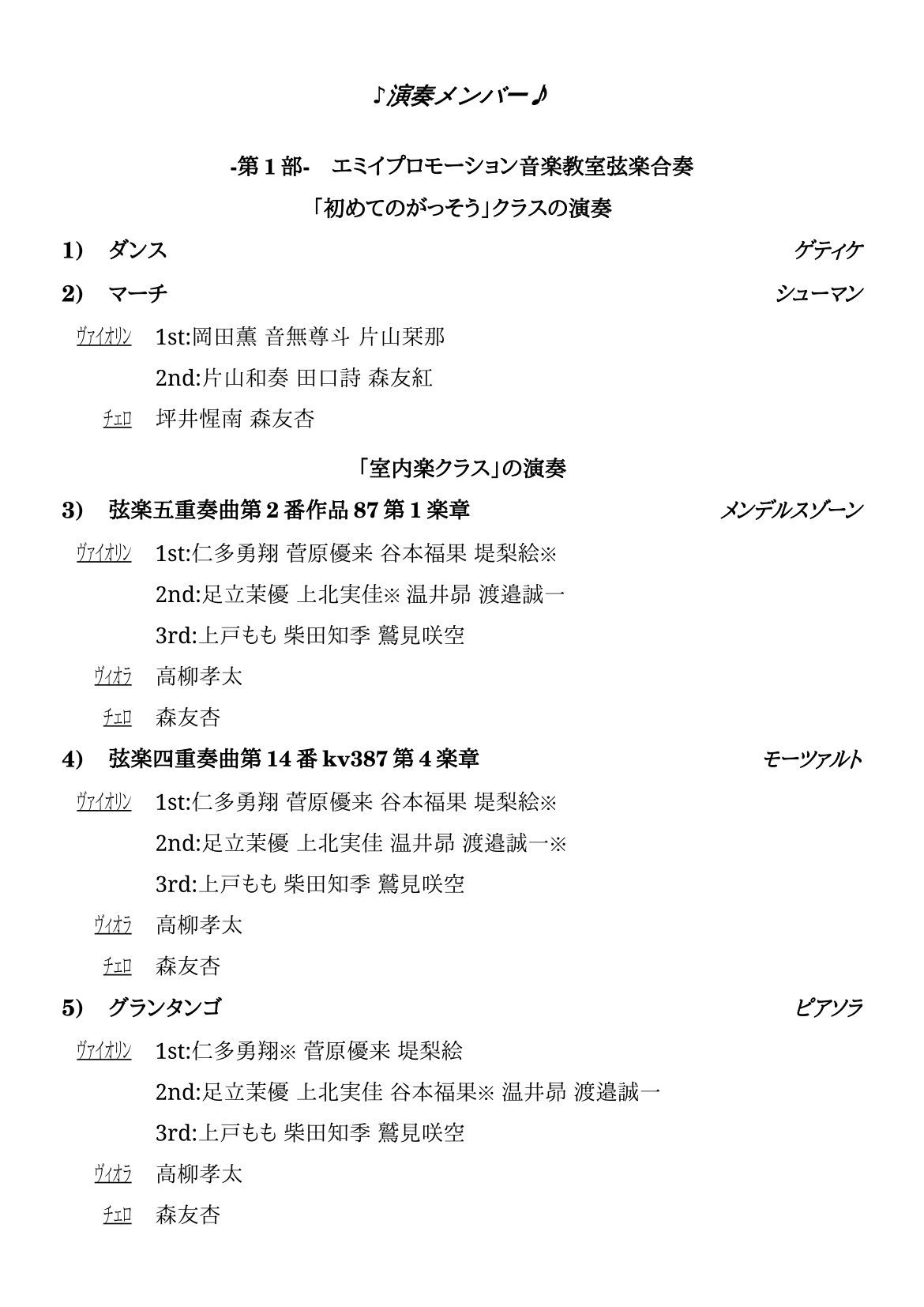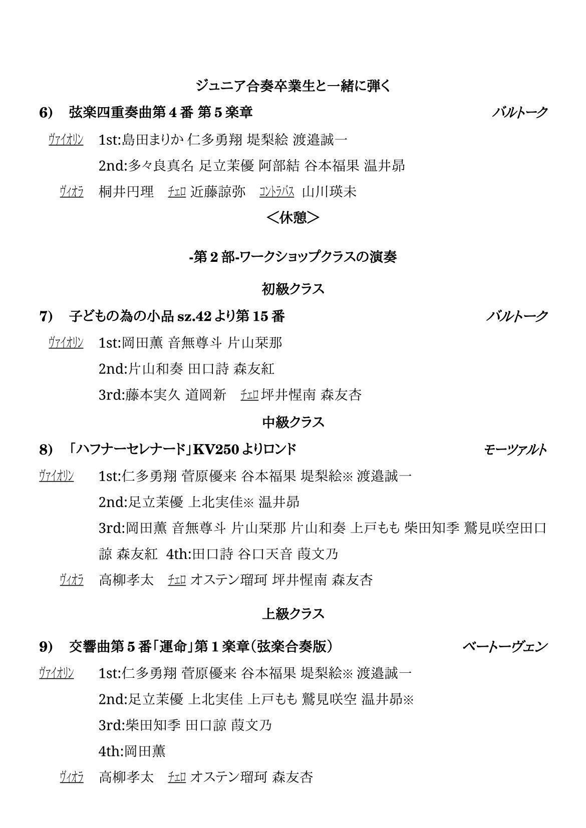 | 子どもの為の室内楽ワークショップVol.8発表会 2026年3/26(木)17時開演 場所:大田文化の森ホール 服装:上下白黒または学校の制服、黒靴 (卒業生の皆さんは黒黒等で大丈夫です。) 10:00 卒業生等お手伝い集合&準備 11:00 参加可能な人のみ卒業生曲(午後にもう一度全員でリハします) 13:00 室内楽クラスのみ練習 14:15 ワークショップ上級「ベートーヴェン運命」 14:45頃 ワークショップ中級「モーツァルトロンド」 15:15 ワークショップ初級「バルトーク:子どもの為の小品sz.42より第15番」 15:30 「初めてのがっそう」クラス練習 16:00 卒業生曲「バルトーク:弦楽四重奏曲第4番第5楽章」 (練習が終わった人は、着替え等の準備。また、控室にて食事は可能です。) 16:20-17:00準備 セッティング 16:30開場 参加者全員舞台裏に集合し調弦 17:00開演 前半 ・「初めてのがっそう」ゲティケ&シューマン ・メンデルスゾーン ・モーツァルト14番 ・グランタンゴ ・卒業生曲バルトーク弦楽四重奏曲第4番 17:50休憩(10分程)参加者全員舞台裏に集合し調弦 18:00後半 ワークショップ曲の発表 ・初級:バルトーク子どもの為の小品 ・中級:モーツァルトロンド ・上級:ベートーヴェン運命 19:00 終演 |